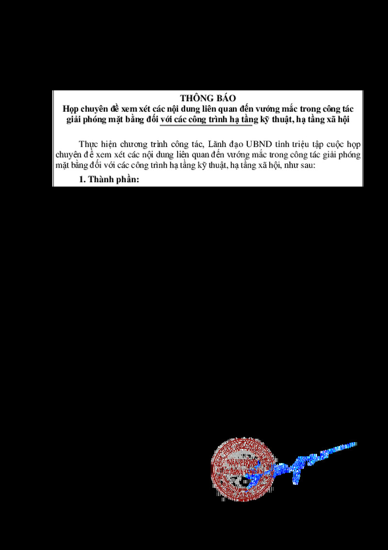 | Tiêu đề văn bản | Họp chuyên đề xem xét các nội dung liên quan đến vướng mắc trong công tác giải phóng mặt bằng đối với các công trình hạ tầng kỹ thuật, hạ tầng xã hội | ||