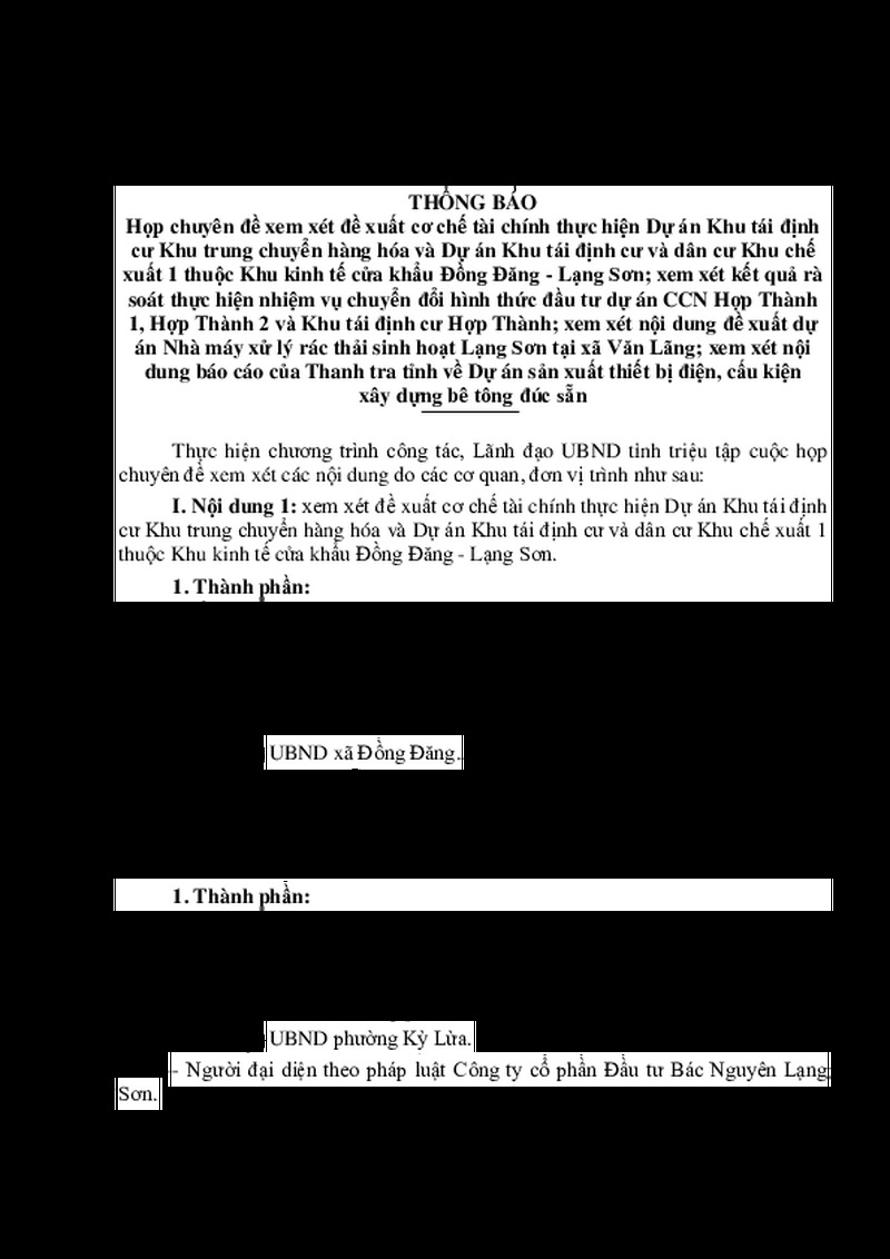 | Tiêu đề văn bản | Họp chuyên đề xem xét đề xuất cơ chế tài chính thực hiện Dự án Khu tái định cư Khu trung chuyển hàng hóa và Dự án Khu tái định cư và dân cư Khu chế xuất 1 thuộc Khu kinh tế cửa khẩu Đồng Đăng - Lạng Sơn; xem xét kết quả rà soát thực hiện nhiệm vụ chuyển đổi hình thức đầu tư dự án CCN Hợp Thành 1, Hợp Thành 2 và Khu tái định cư Hợp Thành; xem xét nội dung đề xuất dự án Nhà máy xử lý rác thải sinh hoạt Lạng Sơn tại xã Văn Lãng; xem xét nội dung báo cáo của Thanh tra tỉnh về Dự án sản xuất thiết bị điện, cấu kiện xây dựng bê tông đúc sẵn | ||