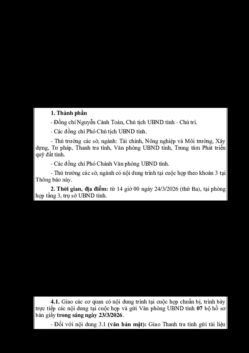 | Tiêu đề văn bản | Họp giao ban Chủ tịch, các Phó Chủ tịch UBND tỉnh (Chiều ngày 24 tháng 3 năm 2026) | ||
