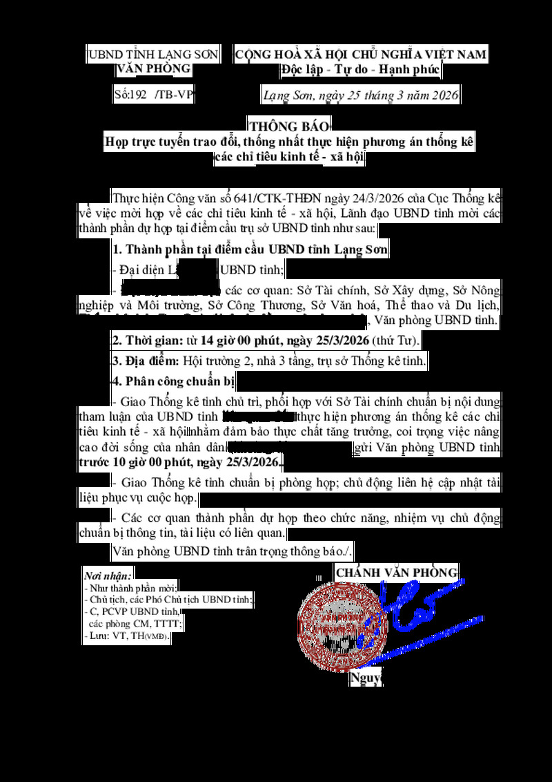 | Tiêu đề văn bản | Họp trực tuyến trao đổi, thống nhất thực hiện phương án thống kê các chỉ tiêu kinh tế - xã hội | ||