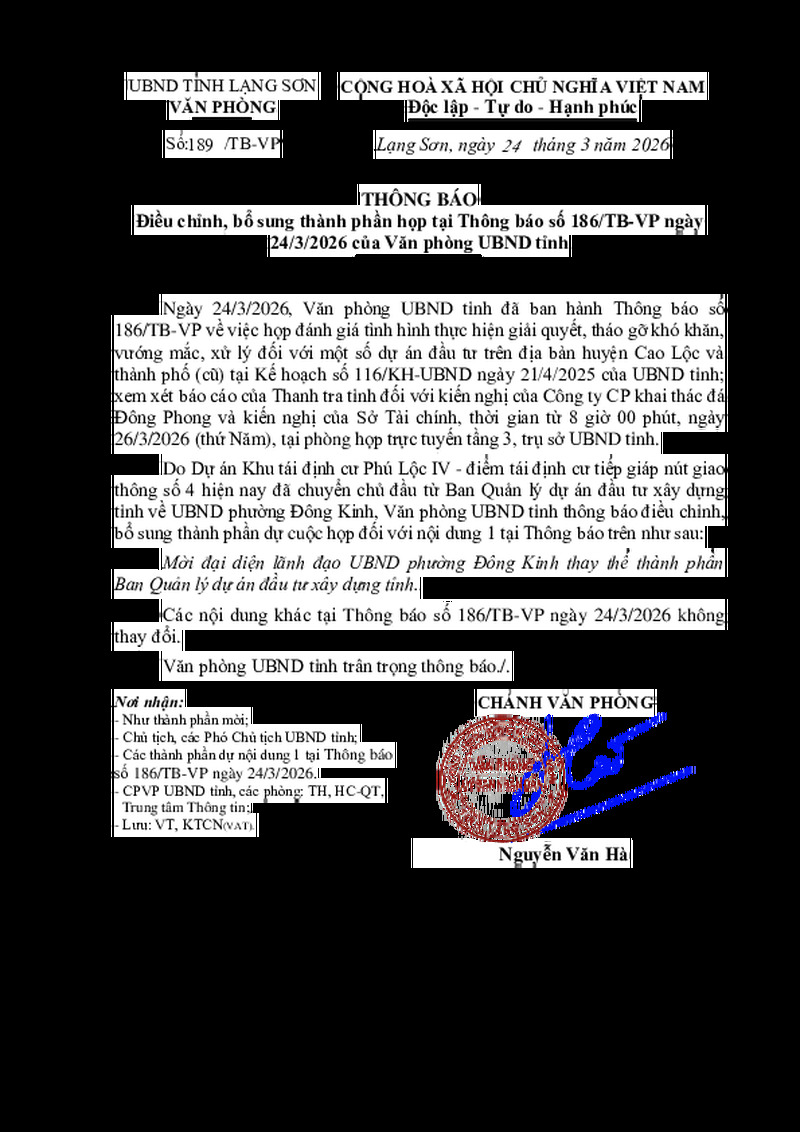 | Tiêu đề văn bản | THÔNG BÁO Điều chỉnh, bổ sung thành phần họp tại Thông báo số 186/TB-VP ngày 24/3/2026 của Văn phòng UBND tỉnh | ||