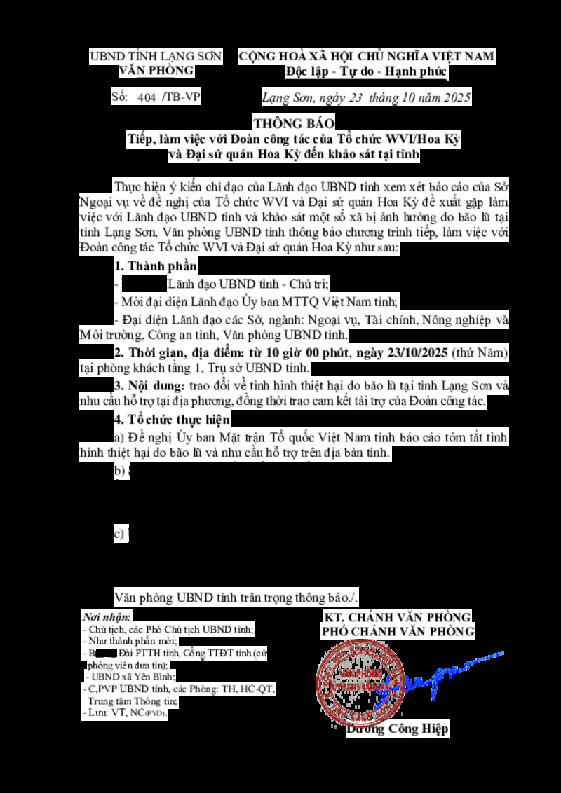 | Tiêu đề văn bản | THÔNG BÁO Tiếp, làm việc với Đoàn công tác của Tổ chức WVI/Hoa Kỳ và Đại sứ quán Hoa Kỳ đến khảo sát tại tỉnh | ||