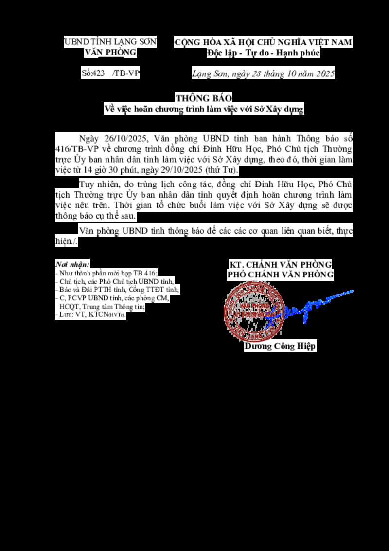 | Tiêu đề văn bản | THÔNG BÁO Về việc hoãn chương trình làm việc với làm việc với Sở Xây dựng | ||