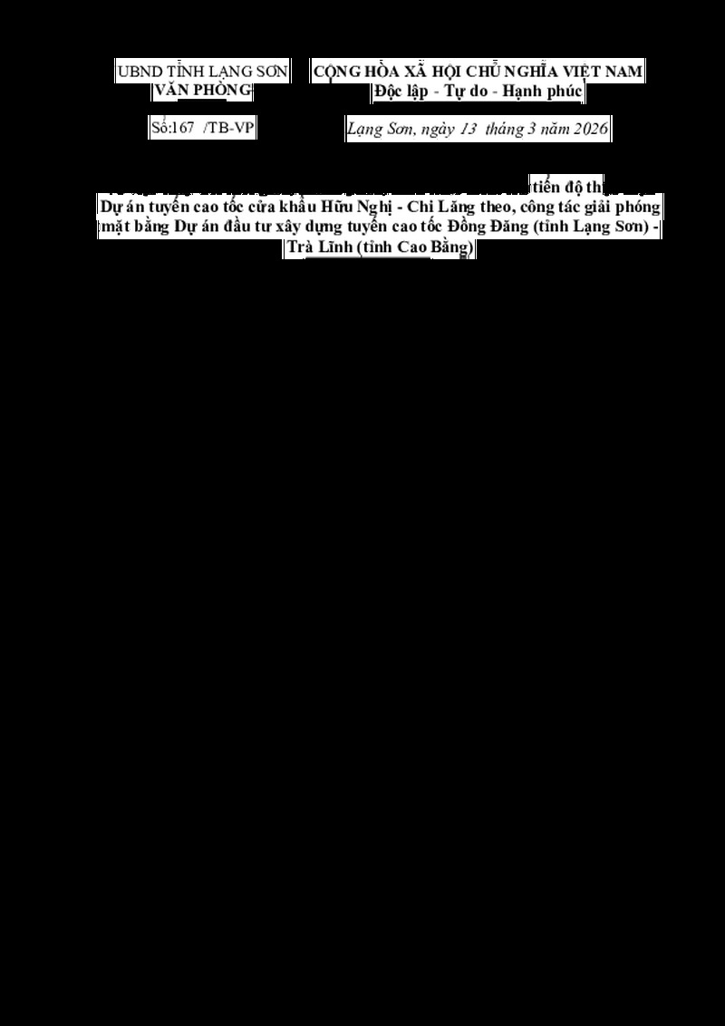 | Tiêu đề văn bản | Thông báo về việc thay đổi thời gian, thành phần, hình thức kiểm tra tiến độ thực hiện Dự án tuyến cao tốc cửa khẩu Hữu Nghị - Chi Lăng theo, công tác giải phóng mặt bằng Dự án đầu tư xây dựng tuyến cao tốc Đồng Đăng (tỉnh Lạng Sơn) - Trà Lĩnh (tỉnh Cao Bằng) | ||