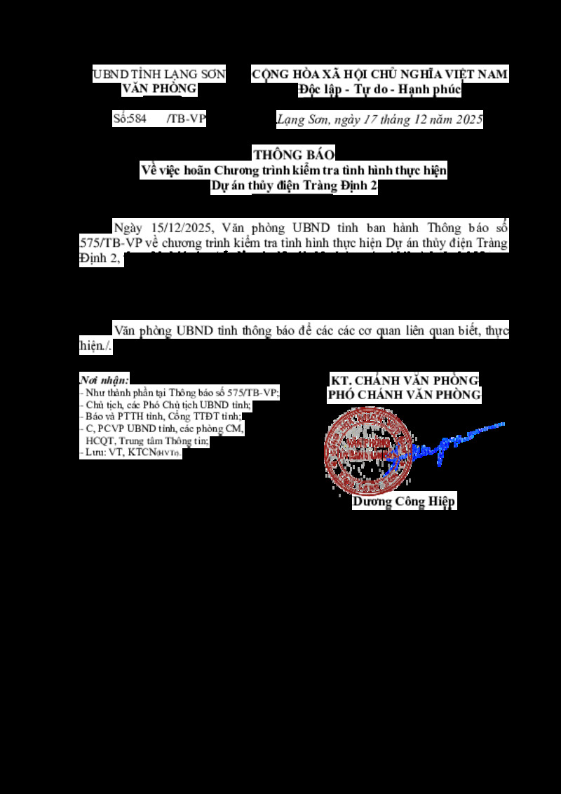| Tiêu đề văn bản | Về việc hoãn Chương trình kiểm tra tình hình thực hiện Dự án thủy điện Tràng Định 2 | ||
