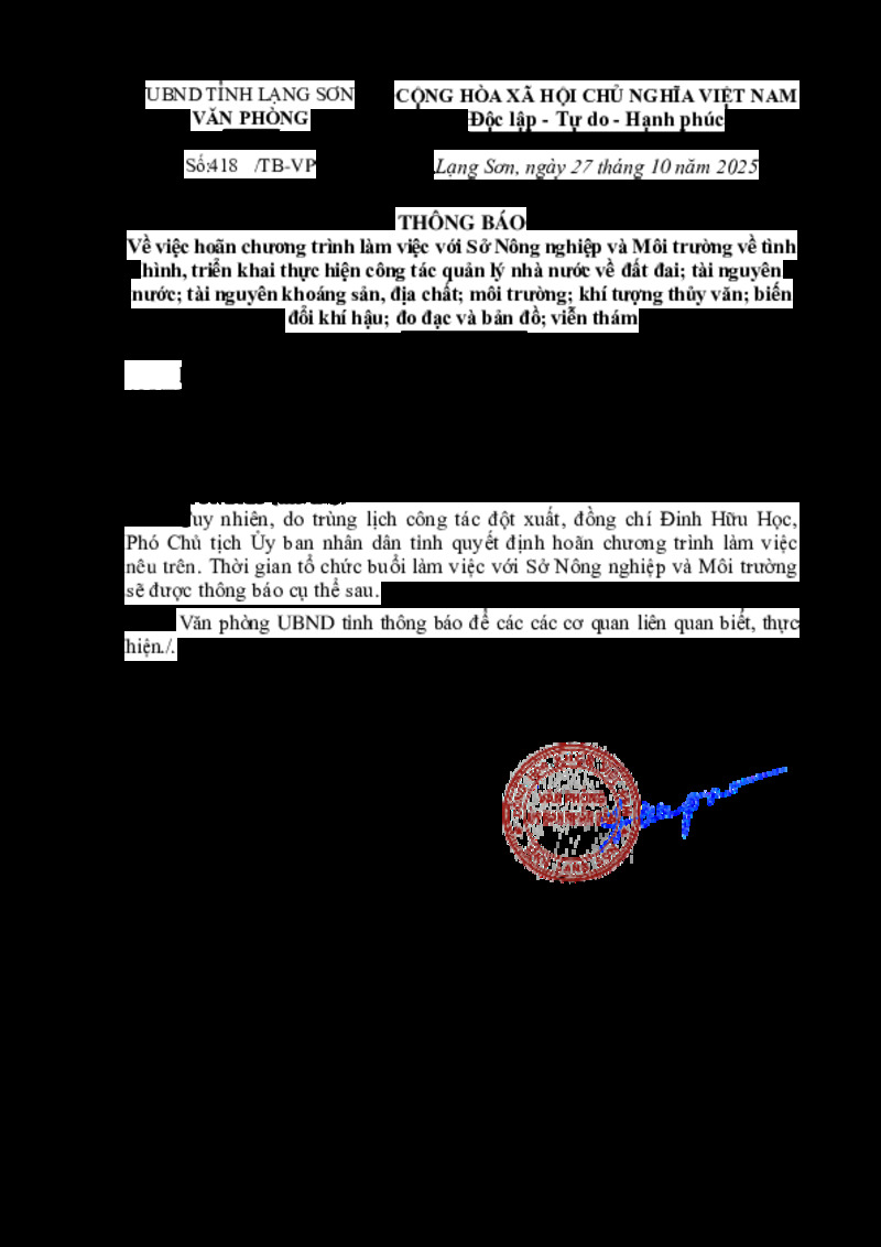 | Tiêu đề văn bản | Về việc hoãn chương trình làm việc với Sở Nông nghiệp và Môi trường về tình hình, triển khai thực hiện công tác quản lý nhà nước về đất đai; tài nguyên nước; tài nguyên khoáng sản, địa chất; môi trường; khí tượng thủy văn; biến đổi khí hậu; đo đạc và bản đồ; viễn thám | ||