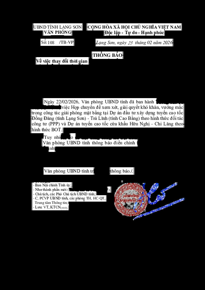 | Tiêu đề văn bản | Về việc thay đổi thời gian Họp chuyên đề xem xét, giải quyết khó khăn, vướng mắc trong công tác giải phóng mặt bằng tại Dự án đầu tư xây dựng tuyến cao tốc Đồng Đăng (tỉnh Lạng Sơn) - Trà Lĩnh (tỉnh Cao Bằng) theo hình thức đối tác công tư (PPP) và Dự án tuyến cao tốc cửa khẩu Hữu Nghị - Chi Lăng theo hình thức BOT | ||