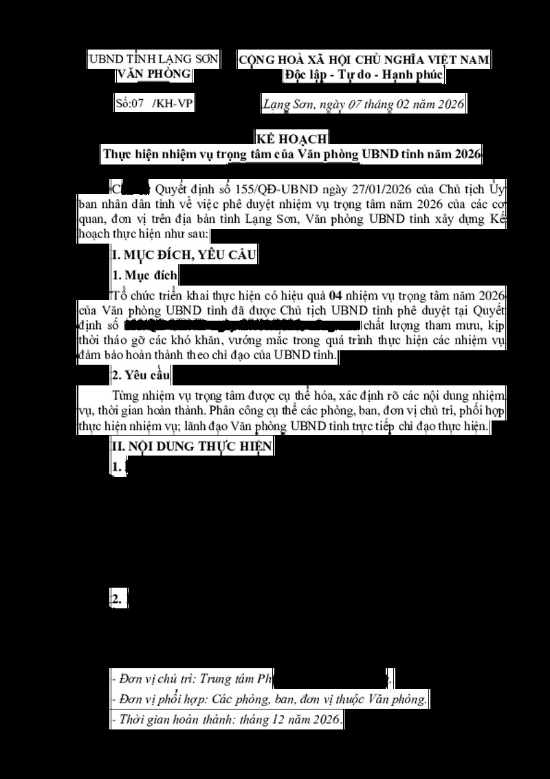 | Tiêu đề văn bản | Thực hiện nhiệm vụ trọng tâm của Văn phòng UBND tỉnh năm 2026 | ||