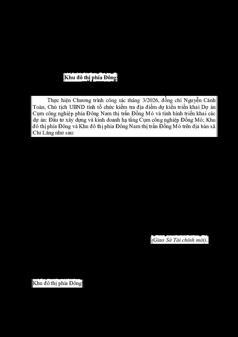 | Tiêu đề văn bản | Chương trình kiểm tra các dự án: Cụm công nghiệp phía Đông Nam thị trấn Đồng Mỏ; Đầu tư xây dựng và kinh doanh hạ tầng Cụm công nghiệp Đồng Mỏ; Khu đô thị phía Đông và Khu đô thị phía Đông Nam thị trấn Đồng Mỏ trên địa bàn xã Chi Lăng | ||