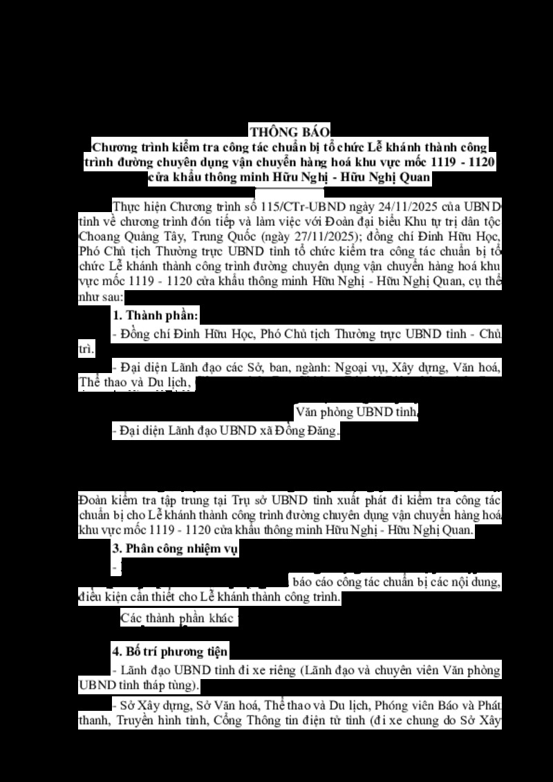 | Tiêu đề văn bản | Chương trình kiểm tra công tác chuẩn bị tổ chức Lễ khánh thành công trình đường chuyên dụng vận chuyển hàng hoá khu vực mốc 1119 - 1120 cửa khẩu thông minh Hữu Nghị - Hữu Nghị Quan | ||