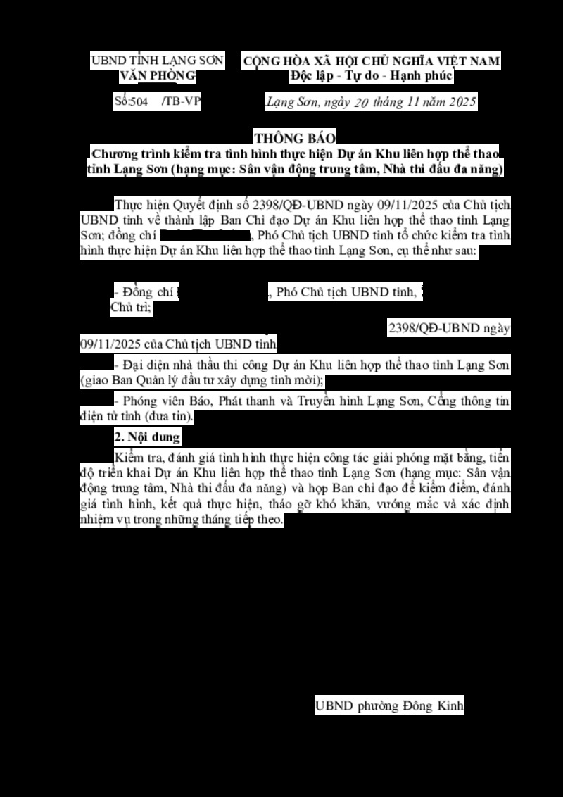 | Tiêu đề văn bản | Chương trình kiểm tra tình hình thực hiện Dự án Khu liên hợp thể thao tỉnh Lạng Sơn (hạng mục: Sân vận động trung tâm, Nhà thi đấu đa năng) | ||