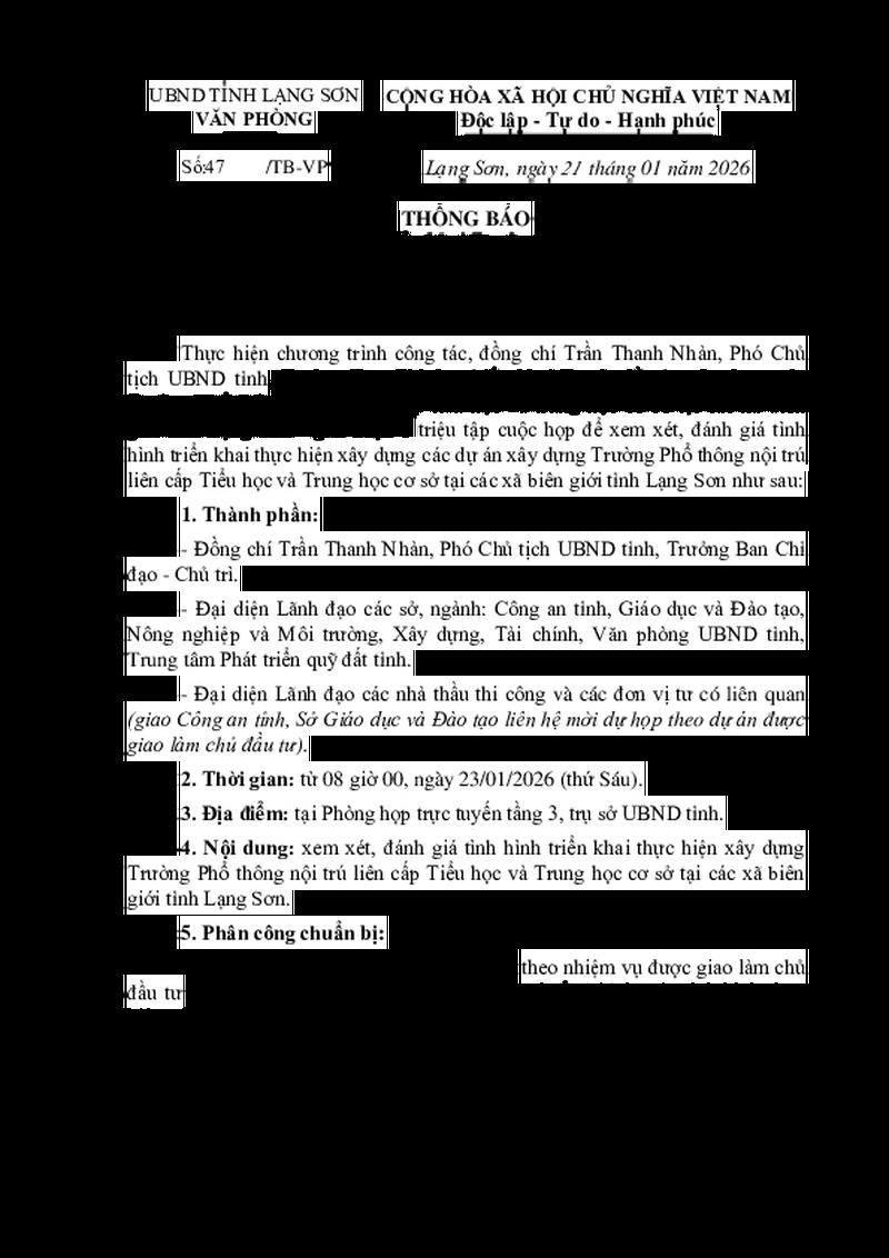 | Tiêu đề văn bản | Họp Ban Chỉ đạo triển khai Dự án đầu tư xây dựng các Trường Phổ thông nội trú liên cấp tiểu học và trung học cơ sở tại các xãbiên giới tỉnh Lạng Sơn | ||