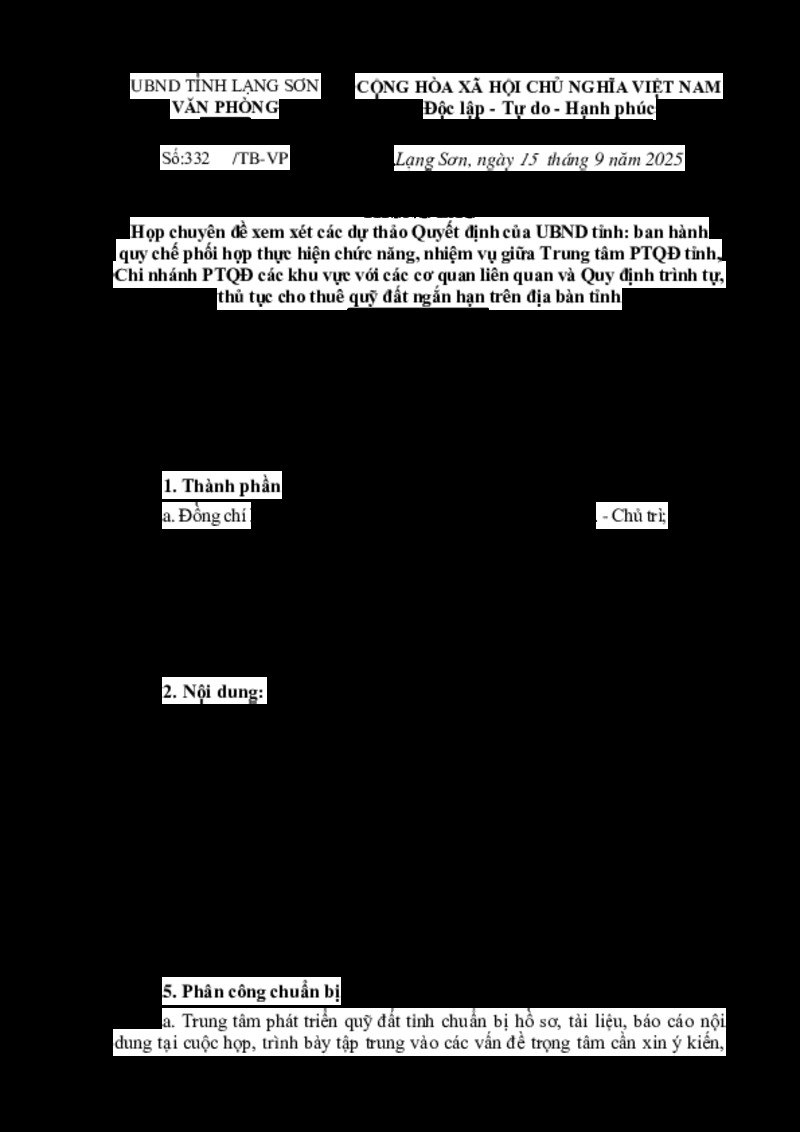 Tiêu đề văn bản | Họp chuyên đề xem xét các dự thảo Quyết định của UBND tỉnh: ban hành quy chế phối hợp thực hiện chức năng, nhiệm vụ giữa Trung tâm PTQĐ tỉnh, Chi nhánh PTQĐ các khu vực với các cơ quan liên quan và Quy định trình tự, thủ tục cho thuê quỹ đất ngắn hạn trên địa bàn tỉnh | ||