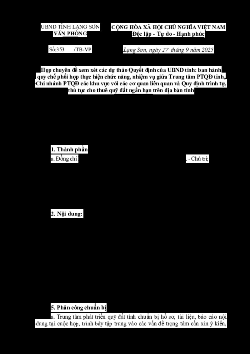 Tiêu đề văn bản | Họp chuyên đề xem xét các dự thảo Quyết định của UBND tỉnh: ban hành quy chế phối hợp thực hiện chức năng, nhiệm vụ giữa Trung tâm PTQĐ tỉnh, Chi nhánh PTQĐ các khu vực với các cơ quan liên quan và Quy định trình tự, thủ tục cho thuê quỹ đất ngắn hạn trên địa bàn tỉnh | ||
