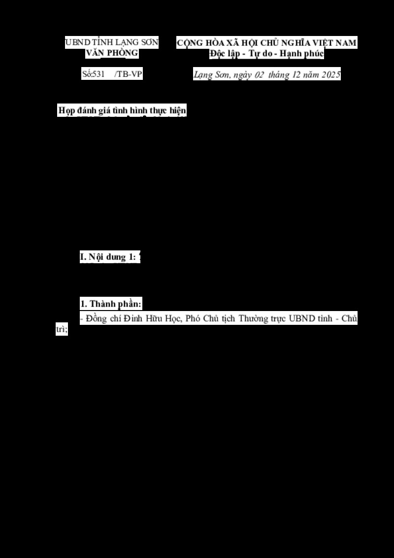 | Tiêu đề văn bản | Họp đánh giá tình hình thực hiện Kế hoạch số 116/KH-UBND ngày 21/4/2025 của UBND tỉnh về triển khai giải quyết, tháo gỡ khó khăn, vướng mắc, xử lý đối với các dự án đầu tư trên địa bàn tỉnh (tại khu vực các huyện Hữu Lũng, Chi Lăng cũ) và đánh giá tiến độ triển khai các dự án khu, cụm công nghiệp đã thành lập trên địa bàn tỉnh | ||