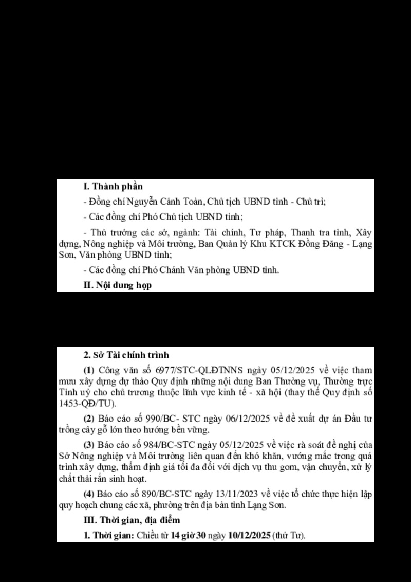 | Tiêu đề văn bản | Họp giao ban Chủ tịch, các Phó Chủ tịch UBND tỉnh (Chiều ngày 10 tháng 12 năm 2025) | ||
