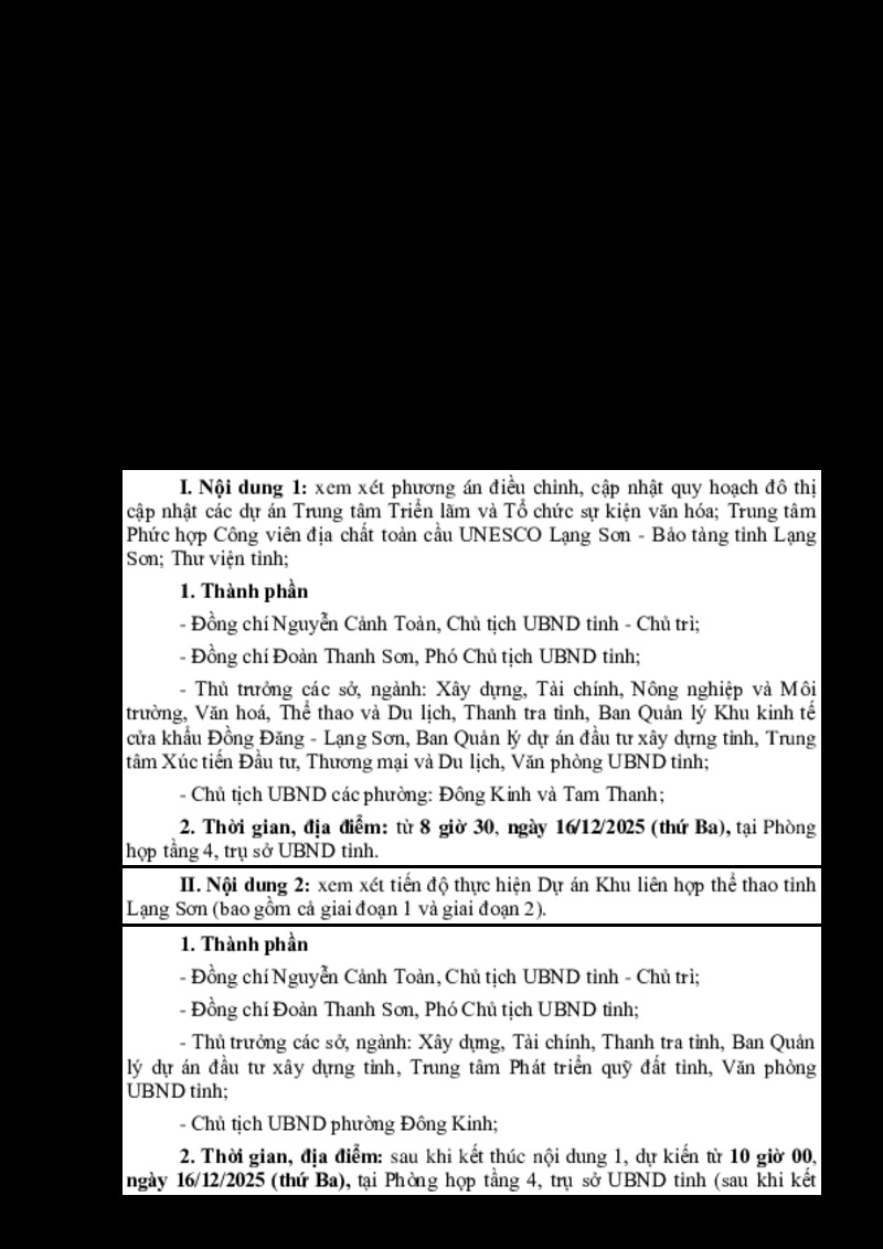 | Tiêu đề văn bản | Họp xem xét phương án quy hoạch liên quan đến các dự án đầu tư công thuộc lĩnh vực văn hóa, dự kiến khởi công mới thuộc Kế hoạch đầu tư công giai đoạn 2026-2030; tiến độ thực hiện Dự án Khu liên hợp thể thao tỉnh Lạng Sơn | ||