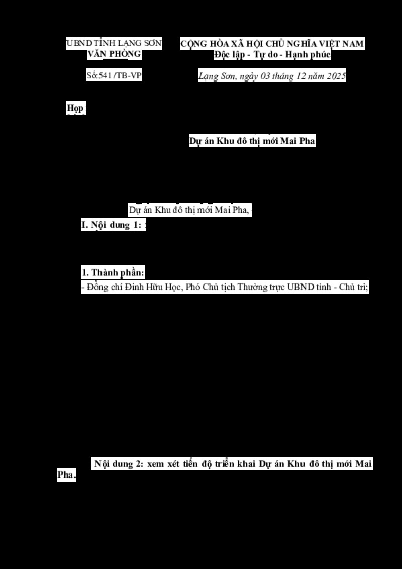 | Tiêu đề văn bản | Họp xem xét tiến độ triển khai các dự án: Khu đô thị Nam Hoàng Đồng I, thành phố Lạng Sơn; Điều chỉnh, mở rộng Khu đô thị Nam Hoàng Đồng I, thành phố Lạng Sơn; Khu dân cư N20, thị trấn Cao Lộc, huyện Cao Lộc và Dự án Khu đô thị mới Mai Pha | ||