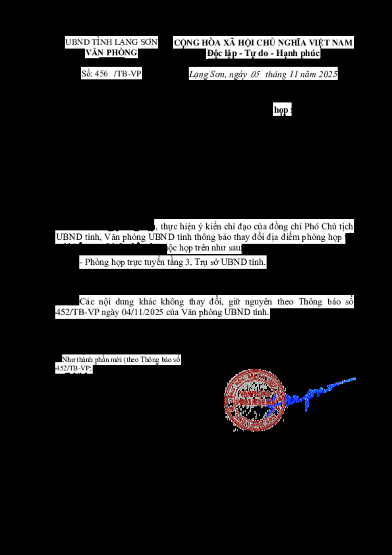 | Tiêu đề văn bản | Thay đổi địa điểm họp và bổ sung thành phần dự họp xem xét các trình tự, thủ tục liên quan đến đầu tư dự án Tượng đài và Quảng trường Bác Hồ với Nhân dân các dân tộc Lạng Sơn và dự án Khu phức hợp công viên địa chất gắn với Bảo tàng tỉnh | ||