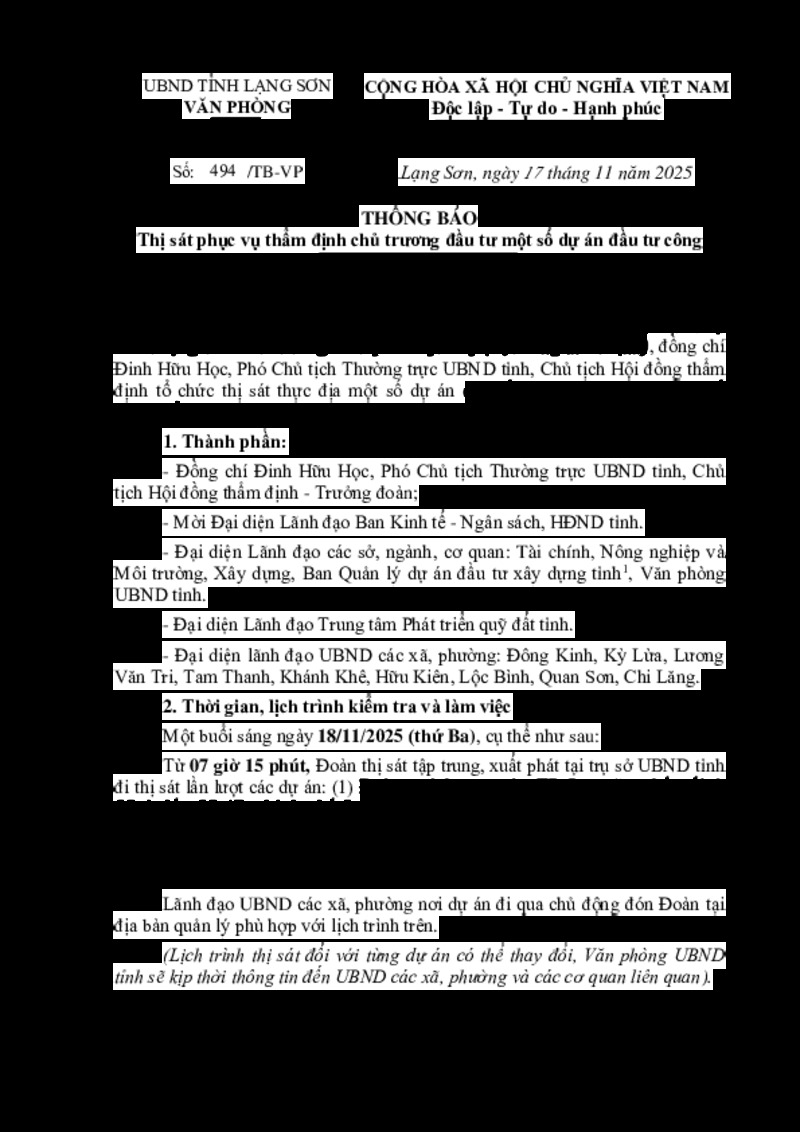 | Tiêu đề văn bản | Thị sát phục vụ thẩm định chủ trương đầu tư một số dự án đầu tư công | ||