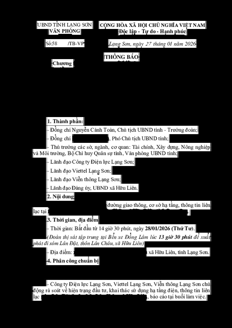 | Tiêu đề văn bản | Thông báo Chương trình thị sát, xem xét hiện trạng đường giao thông, cơ sở hạ tầng, thông tin liên lạc tại xóm Lân Đặt thuộc thôn Lân Châu, xã Hữu Liên, tỉnh Lạng Sơn | ||