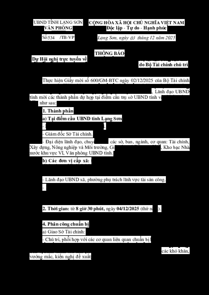 | Tiêu đề văn bản | Thông báo Dự Hội nghị trực tuyến về về bố trí sắp xếp, xử lý trụ sở, tài sản công sau khi sắp xếp tổ chức bộ máy, sắp xếp đơn vị hành chính do Bộ Tài chính chủ trì | ||
