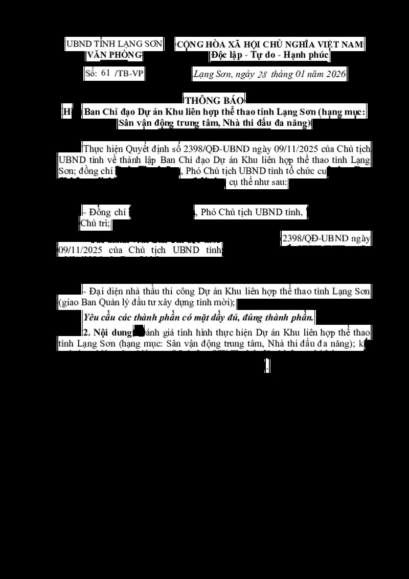 | Tiêu đề văn bản | THÔNG BÁO Họp Ban Chỉ đạo Dự án Khu liên hợp thể thao tỉnh Lạng Sơn (hạng mục: Sân vận động trung tâm, Nhà thi đấu đa năng) | ||