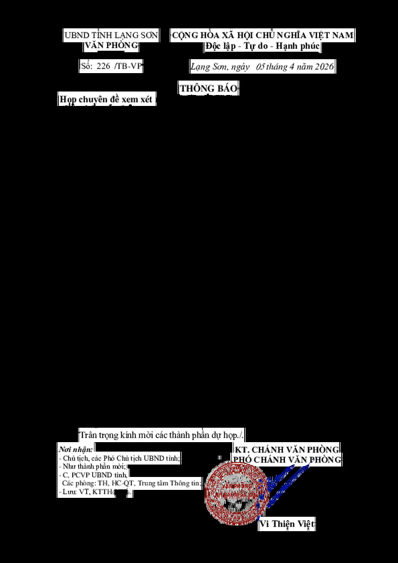 | Tiêu đề văn bản | Thông báo họp chuyên đề xem xét dự thảo Quyết định của Chủ tịch Ủy ban nhân dân tỉnh phân cấp thẩm quyền quyết định xác lập, phê duyệt phương án xử lý tài sản được xác lập quyền sở hữu toàn dân trên địa bàn tỉnh Lạng Sơn | ||