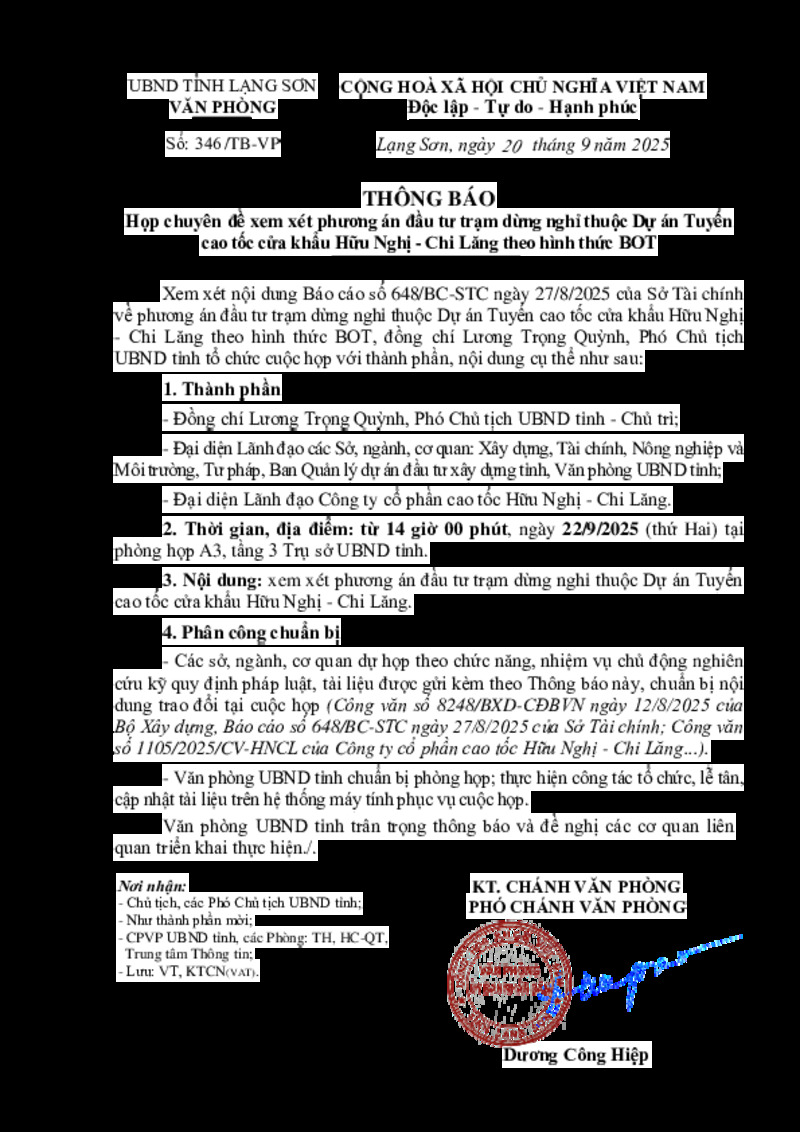 Tiêu đề văn bản | THÔNG BÁO Họp chuyên đề xem xét phương án đầu tư trạm dừng nghỉ thuộc Dự án Tuyến cao tốc cửa khẩu Hữu Nghị - Chi Lăng theo hình thức BOT | ||