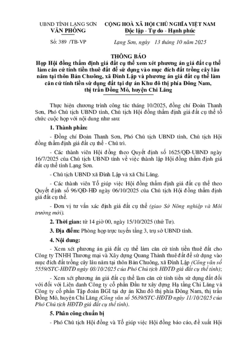 Tiêu đề văn bản | Thông báo họp Hội đồng thẩm định giá đất cụ thể xem xét phương án giá đất cụ thể làm căn cứ tính tiền thuê đất để sử dụng vào mục đích đất trồng cây lâu năm tại thôn Bản Chuông, xã Đình Lập và phương án giá đất cụ thể làm căn cứ tính tiền sử dụng đất tại dự án Khu đô thị phía Đông Nam, thị trấn Đồng Mỏ, huyện Chi Lăng | ||