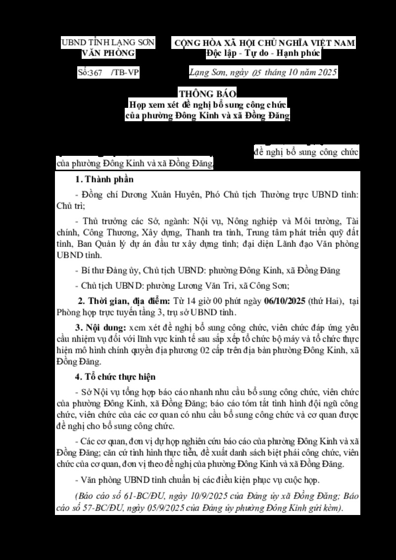Tiêu đề văn bản | Thông báo họp xem xét đề nghị bổ sung công chức của phường Đông Kinh và xã Đồng Đăng | ||
