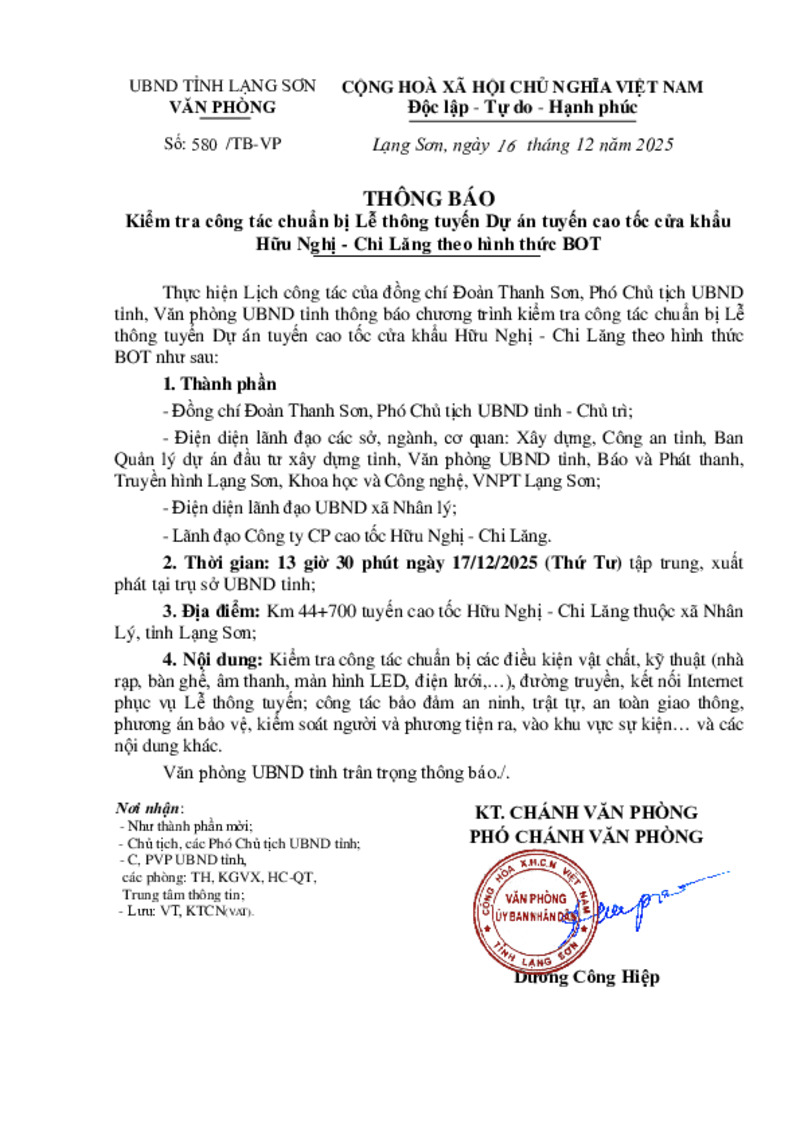 | Tiêu đề văn bản | THÔNG BÁO Kiểm tra công tác chuẩn bị Lễ thông tuyến Dự án tuyến cao tốc cửa khẩu Hữu Nghị - Chi Lăng theo hình thức BOT | ||