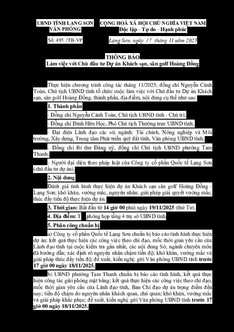 | Tiêu đề văn bản | THÔNG BÁO Làm việc với Chủ đầu tư Dự án Khách sạn, sân golf Hoàng Đồng | ||
