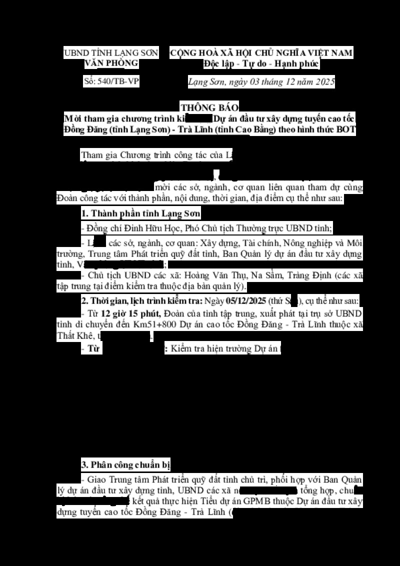 | Tiêu đề văn bản | THÔNG BÁO Mời tham gia chương trình kiểm tra Dự án đầu tư xây dựng tuyến cao tốc Đồng Đăng (tỉnh Lạng Sơn) - Trà Lĩnh (tỉnh Cao Bằng) theo hình thức BOT | ||