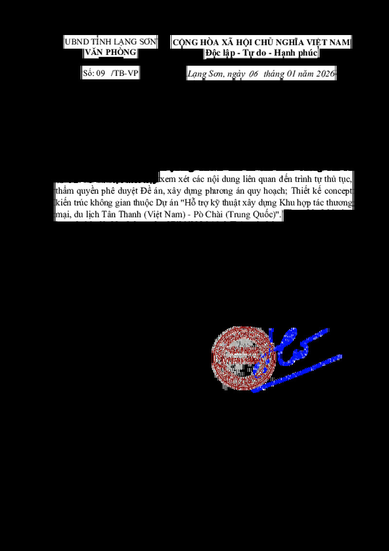 | Tiêu đề văn bản | THÔNG BÁO Thay đổi thời gian cuộc họp xem xét các nội dung liên quan đến trình tự thủ tục, thẩm quyền phê duyệt Đề án, xây dựng phương án quy hoạch; Thiết kế concept kiến trúc không gian thuộc Dự án "Hỗ trợ kỹ thuật xây dựng Khu hợp tác thương mại, du lịch Tân Thanh (Việt Nam) - Pò Chài (Trung Quốc)" | ||
