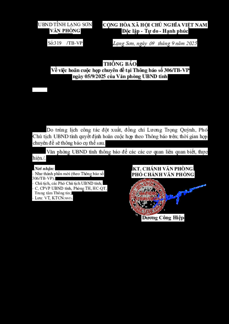 Tiêu đề văn bản | Về việc hoãn cuộc họp chuyên đề tại Thông báo số 306/TB-VP ngày 05/9/2025 của Văn phòng UBND tỉnh | ||