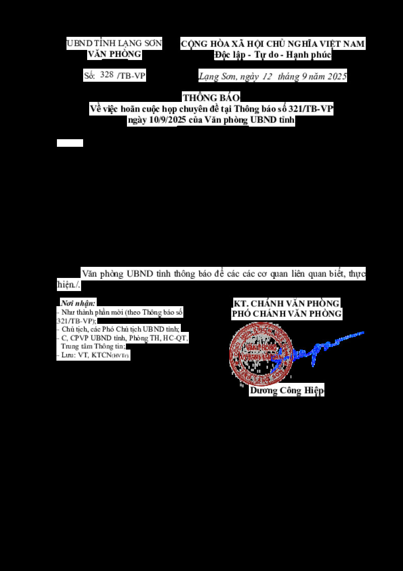 Tiêu đề văn bản | Về việc hoãn cuộc họp chuyên đề tại Thông báo số 321/TB-VP ngày 10/9/2025 của Văn phòng UBND tỉnh | ||