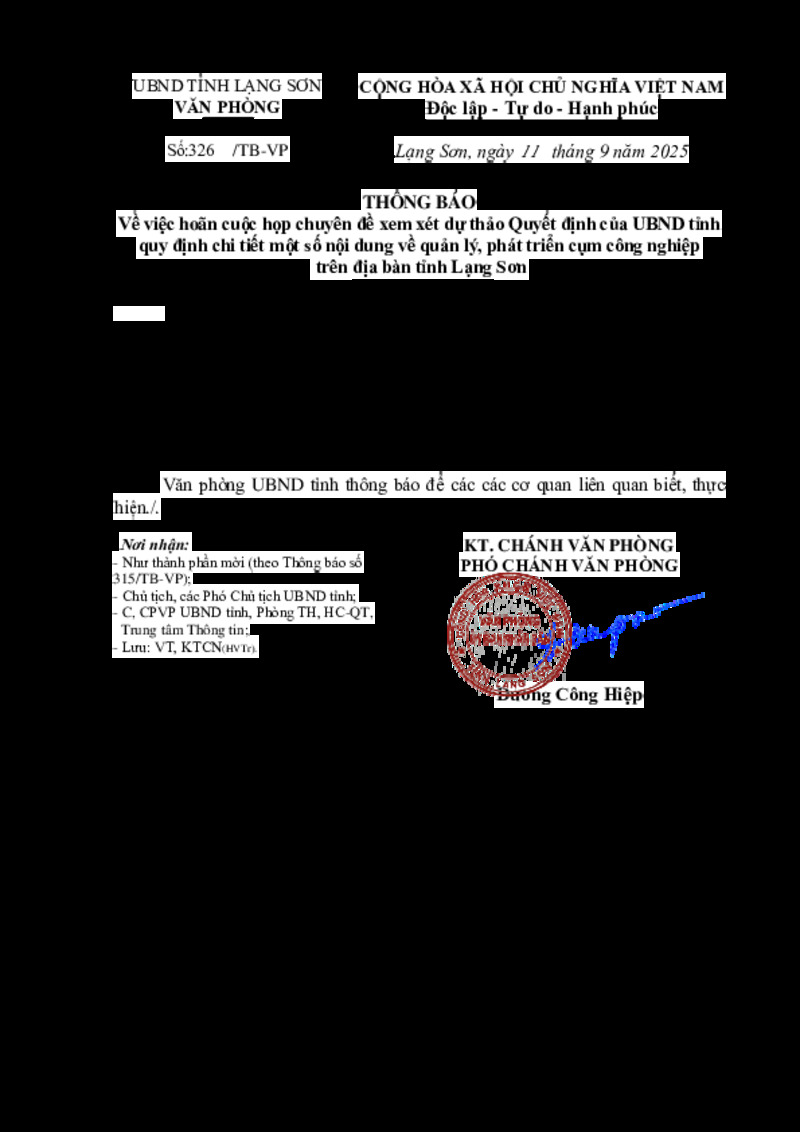 Tiêu đề văn bản | Về việc hoãn cuộc họp chuyên đề xem xét dự thảo Quyết định của UBND tỉnh quy định chi tiết một số nội dung về quản lý, phát triển cụm công nghiệp trên địa bàn tỉnh Lạng Sơn | ||