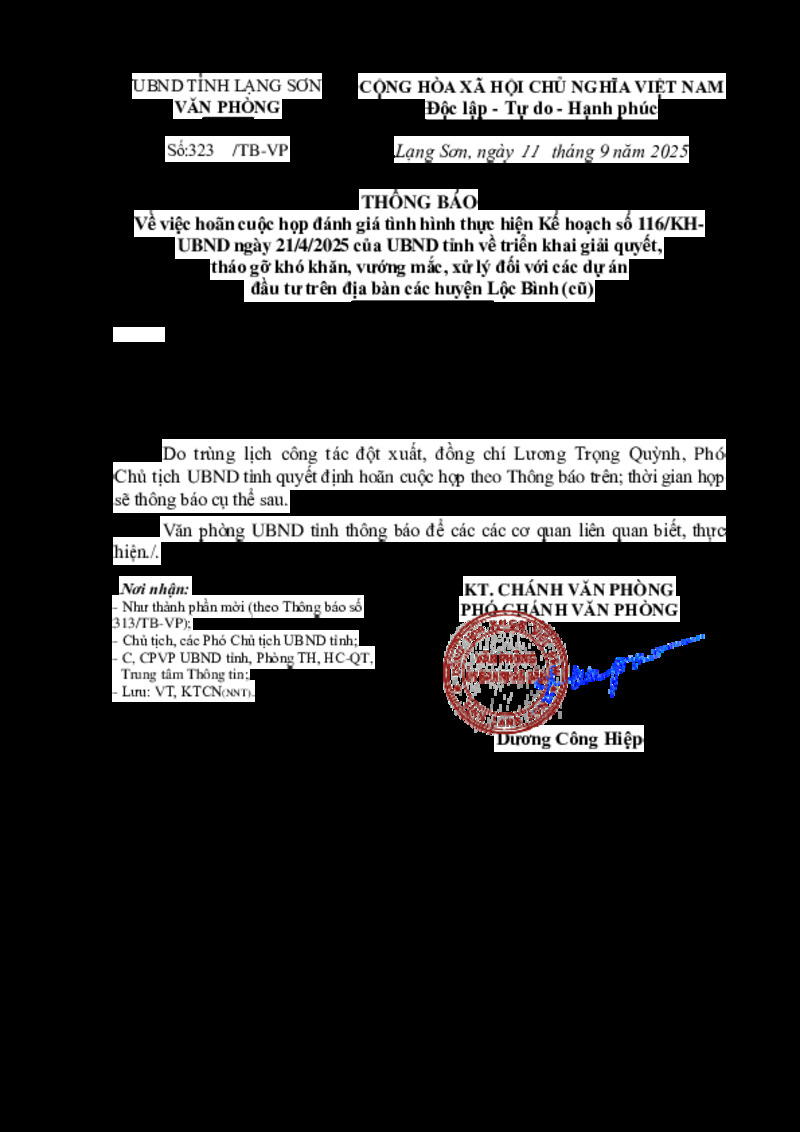 Tiêu đề văn bản | Về việc hoãn cuộc họp đánh giá tình hình thực hiện Kế hoạch số 116/KH-UBND ngày 21/4/2025 của UBND tỉnh về triển khai giải quyết, tháo gỡ khó khăn, vướng mắc, xử lý đối với các dự án đầu tư trên địa bàn các huyện Lộc Bình (cũ) | ||