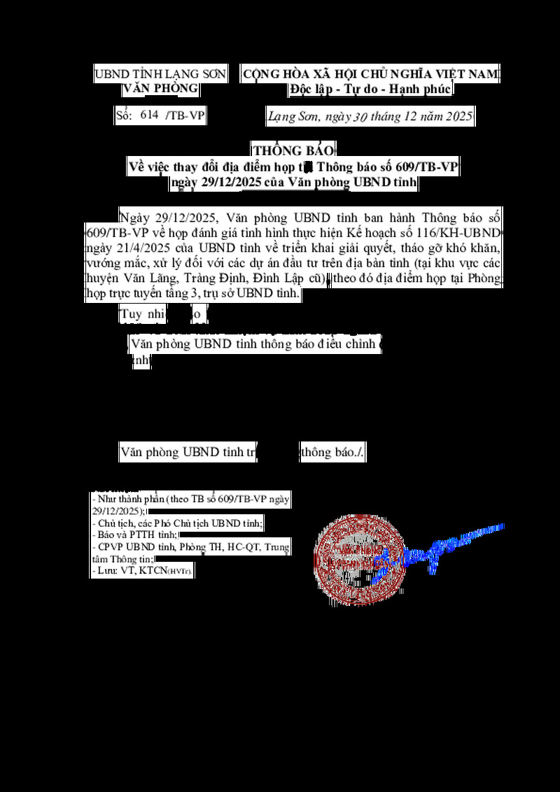 | Tiêu đề văn bản | Về việc thay đổi địa điểm họp tại Thông báo số 609/TB-VP ngày 29/12/2025 của Văn phòng UBND tỉnh | ||