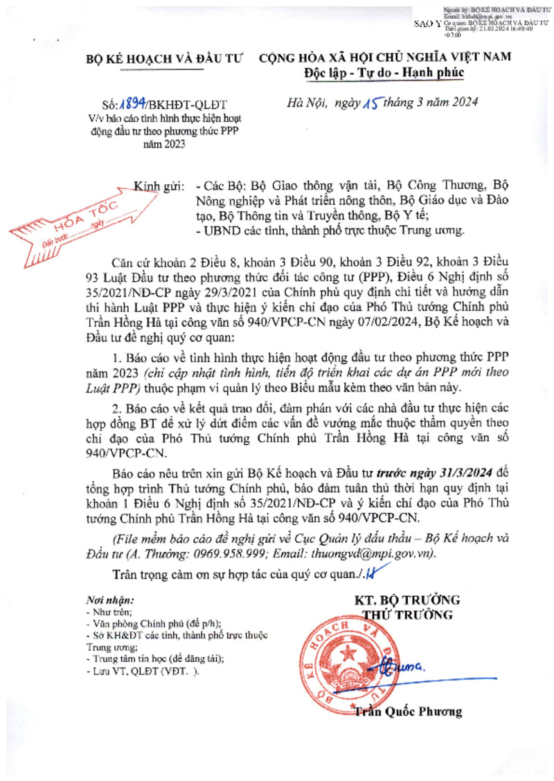 | Tiêu đề văn bản | Về việc Báo cáo tình hình thực hiện hoạt động đầu tư theo phương thức PPP năm 2023 | ||